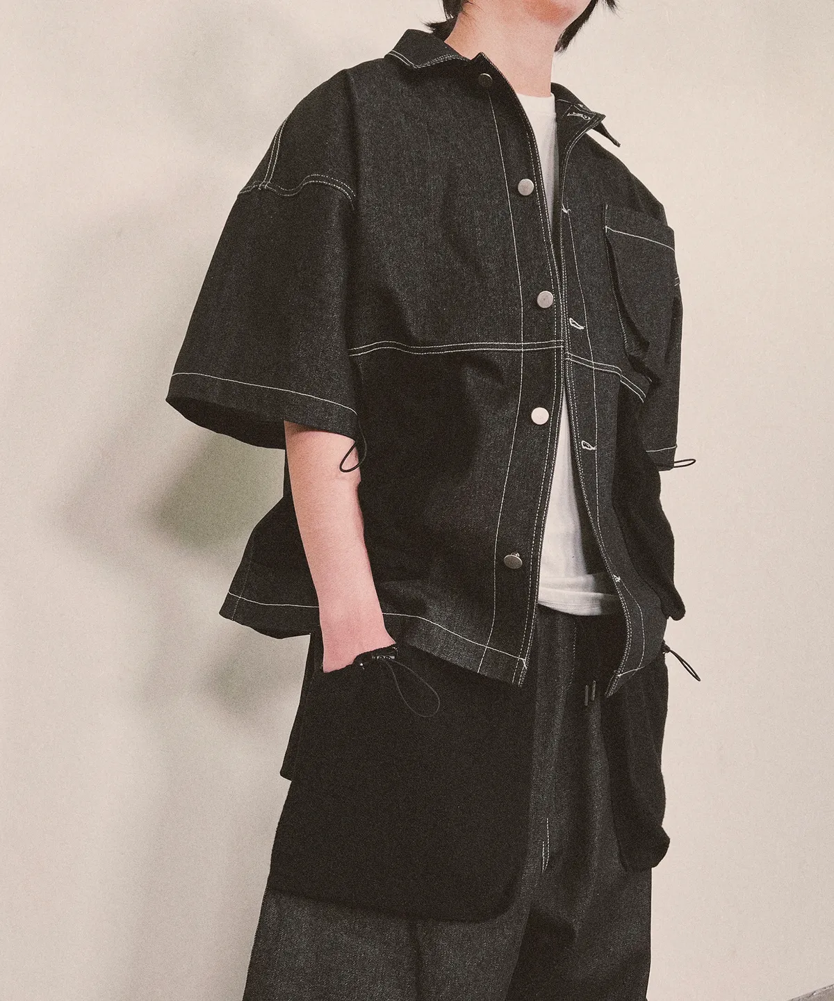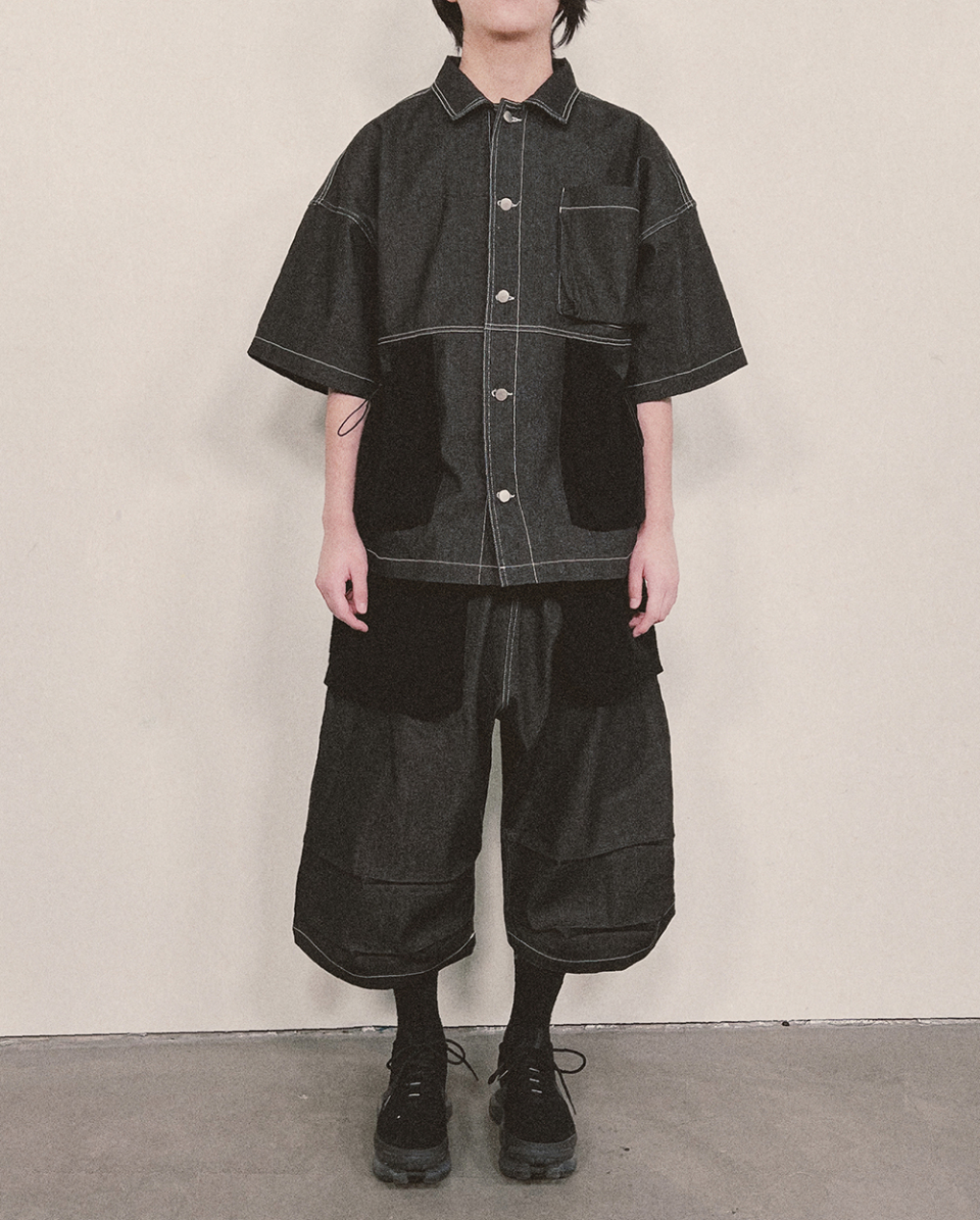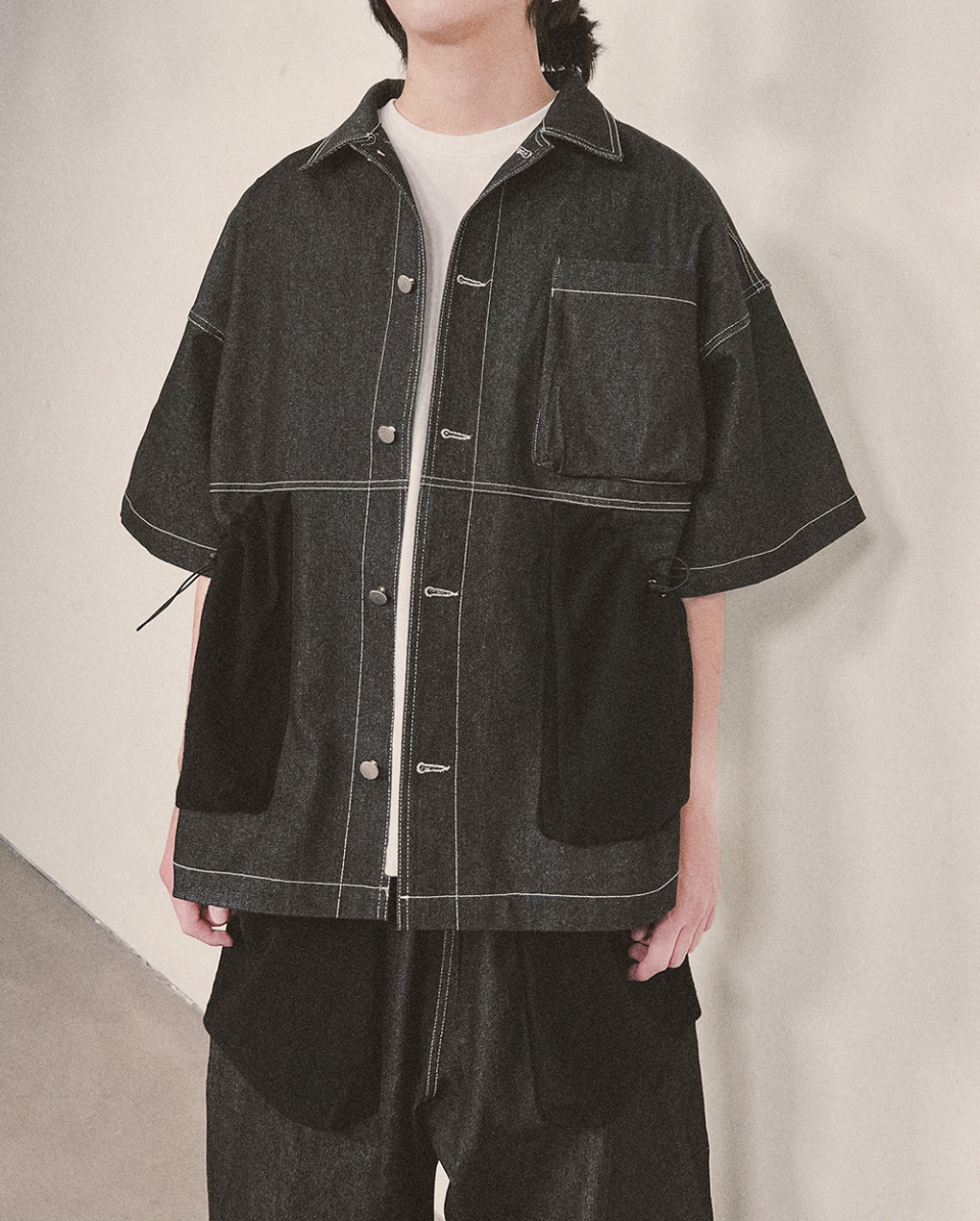牛仔襯衫採用反面毛圈布製成的紋理口袋,搭配經典的十字形紐扣設計,兼具襯衫和外套的雙重風格。